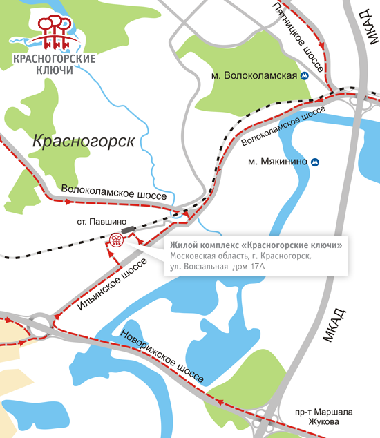 По Волоколамскому шоссе до поста ГАИ, на светофоре прямо, на втором светофоре свернуть направо на улицу Вокзальная, далее по указателям к офису продаж ЖК «Красногорские Ключи». По Новорижскому шоссе до первого поворота направо на Ильинское шоссе, далее прямо на четвертом светофоре свернуть налево на улицу Вокзальная, далее по указателям к офису продаж ЖК «Красногорские Ключи».